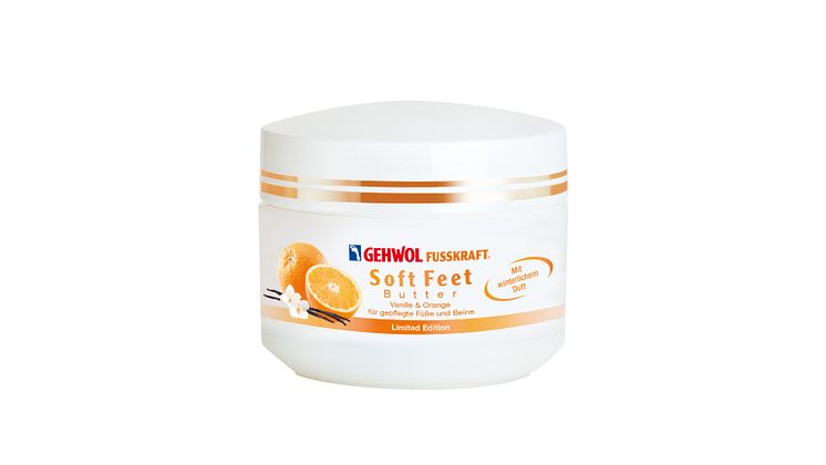 GEHWOL FUSSKRAFT Soft Feet Butter pflegt und verwöhnt beanspruchte Füße und Beine intensiv mit Vanille- und Orangenextrakt und verwöhnt dabei mit einem winterlichen Duft.