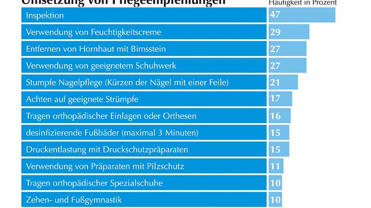 Allerdings zeigt sich auch bei den leitlinienkonformen Maßnahmen ein lückenhaftes Problembewusstsein. Zu den empfohlenen Handlungen gehört beispielsweise die tägliche Inspektion der Füße. Weniger als die Hälfte (47%) folgt diesem Hinweis. Nur 21 Prozent nutzen für die Nagelpflege stumpfes Werkzeug (Feile) und verzichten wegen der Verletzungsgefahr auf spitze Scheren oder Zangen. Bei der Reinigung der Füße überschreiten viele Befragte die Dauer des Fußbades, das nicht länger als drei bis fünf Minuten dauern sollte, bei maximal 37 bis 38 Grad Celsius. Nur 15 Prozent der Diabetiker baden überhaupt ihre Füße, die meisten länger als drei Minuten. Feuchtigkeitscreme verwendet lediglich ein Drittel der Befragten, obwohl hydrolipidhaltige Pflegemittel Hauttrockenheit und Hyperkeratose vorbeugen. Auf Präparate mit Pilzschutz achten sogar nur elf Prozent der Diabetiker.