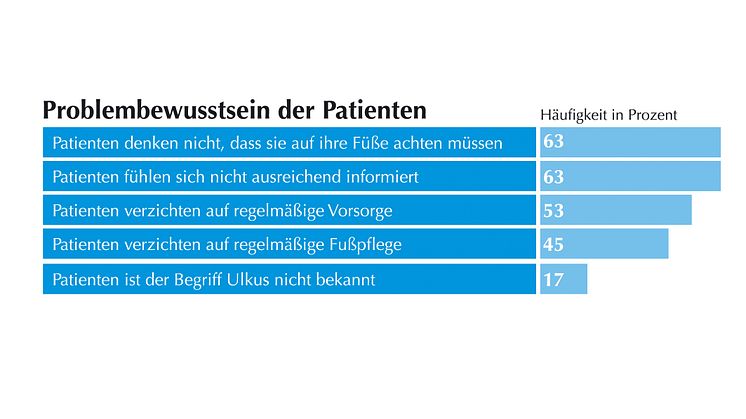Trotz vorhandener Risikofaktoren bis hin zur aktuellen Ulkus-Erfahrung wusste ein großer Teil der Befragten kaum über die Problematik Bescheid. So wussten zwei von drei Diabetikern (63%) nicht, dass sie auf ihre Füße achten sollten. 53 Prozent gaben an, auf regelmäßige Vorsorgebesuche bei einem Podologen zu verzichten. Auch zuhause betreibt fast die Hälfte der Befragten (45%) Fußpflege höchstens gelegentlich und nur selten konsequent.